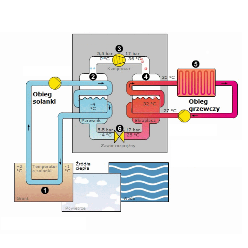 Czynnik chłodniczy ekologiczny np R 32 w postaci cieczy pod niskim ciśnieniem przepływa do wymiennika płytowego – parowacza (parownika), w którym odparowując zabiera ciepło z glikolu ogrzanego w wymienniku gruntowym(kolektor poziomy lub pionowy(odwiert)).